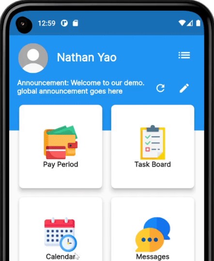 A team collaboration app featuring calendars, events, timecards, task board, etc. Built
